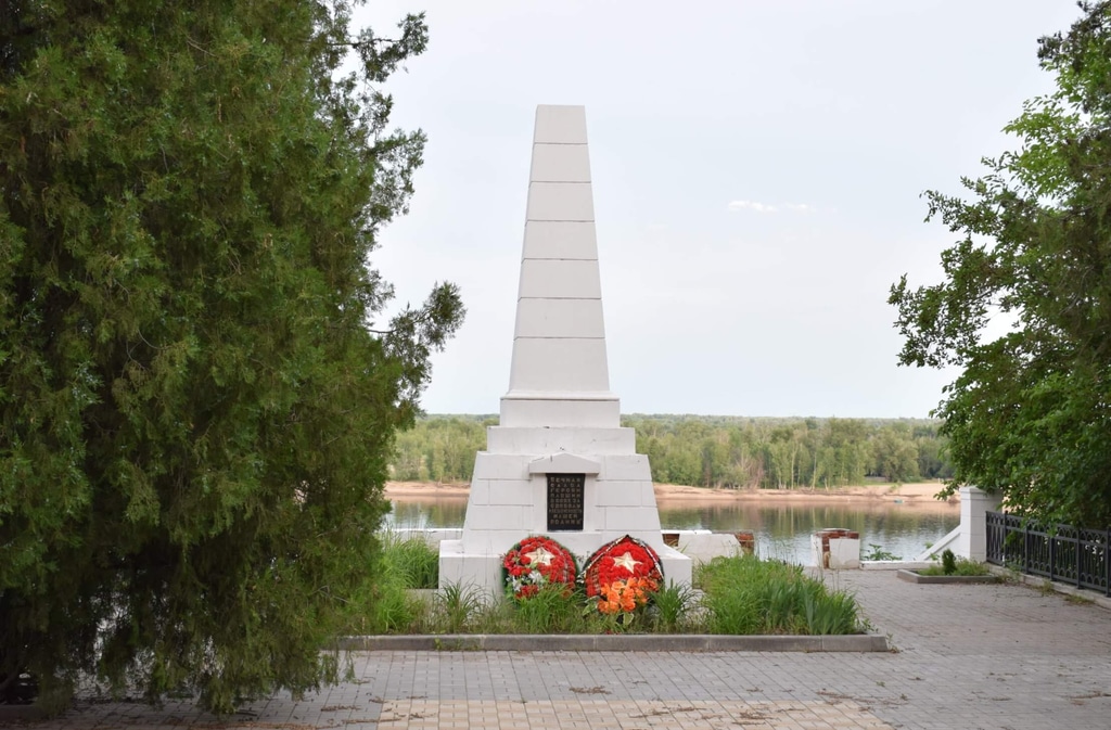 Памятник летчику Виктору Хользунову появился на набережной еще до войны. Летчик был уроженцем этих мест, а погиб при испытании самолета перед самой войной в 1939 году. В 1940 году ему в городе установили памятник. Он каким-то удивительным образом пережил все перипетии Сталинградской битвы. Пострадал только постамент памятника, а сама скульптура оказалась практически целой. В 1949 году ее установили на новый постамент.