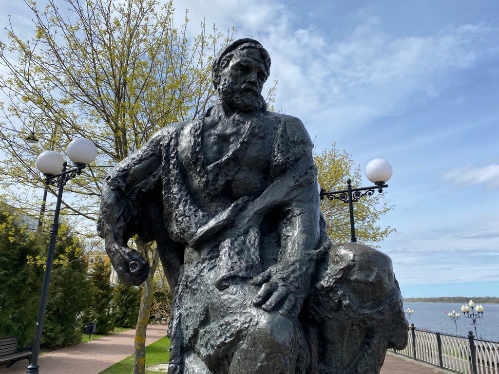 Дальше по Волжской набережной за зданиями бирж возвышается памятник бурлаку. Такие памятники — большая редкость в наших городах