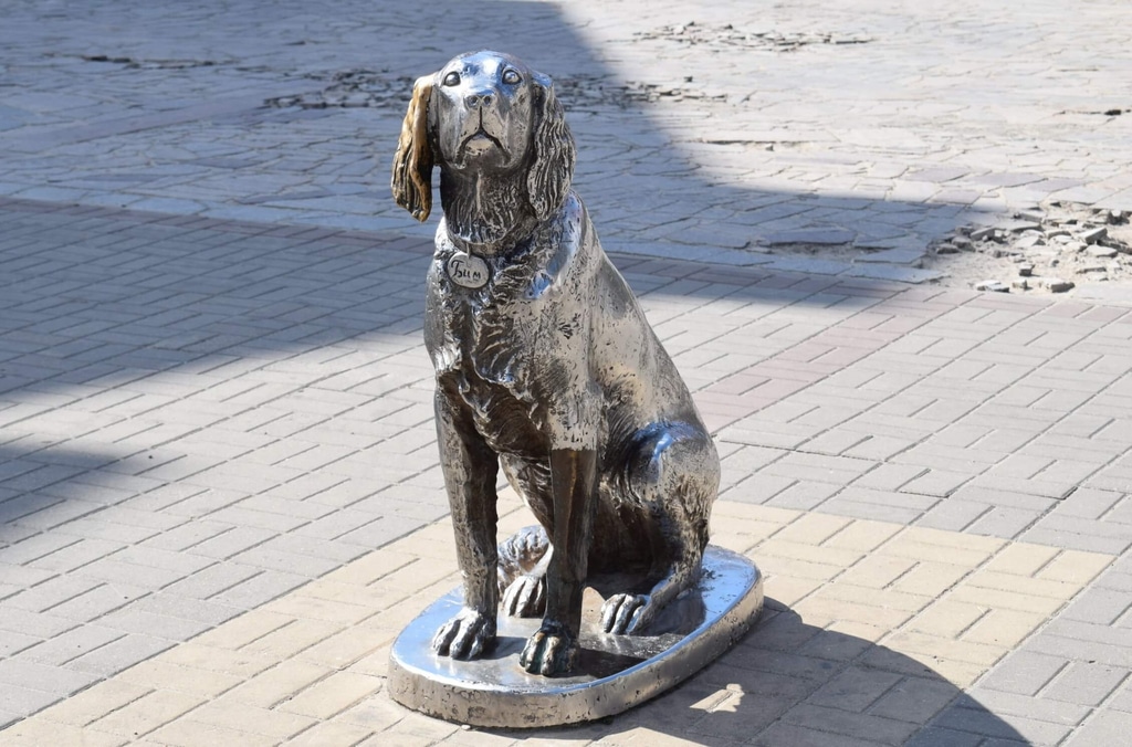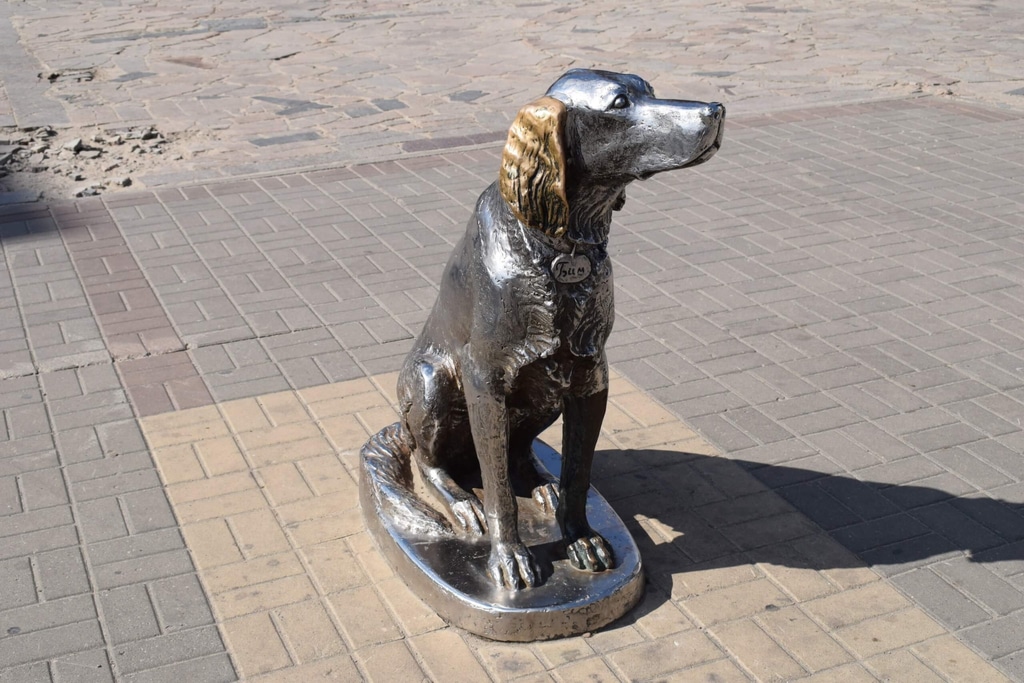 Перед зданием театра памятник легендарному псу Белому Биму Черное ухо. Собака сидит прямо на асфальте и терпеливо ждет своего хозяина.