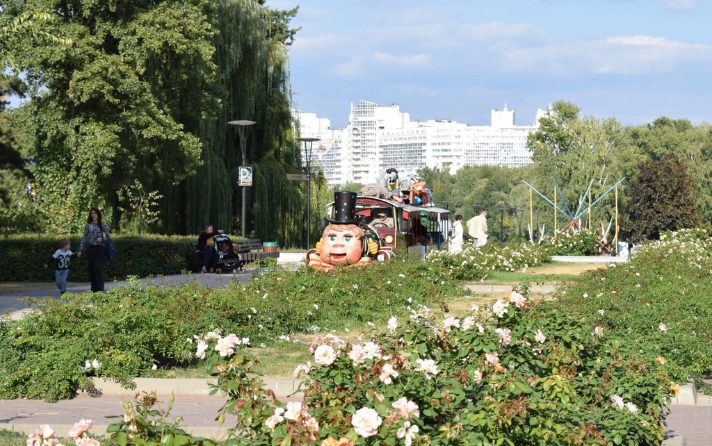 По дорожкам парка бегают симпатичные детские паровозики. Кругом море цветов…