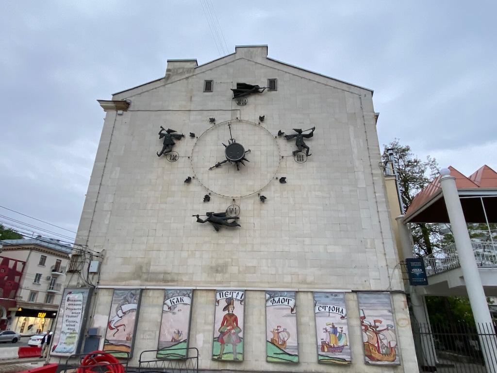 Боковую стену одной из построек украшают сказочные часы.