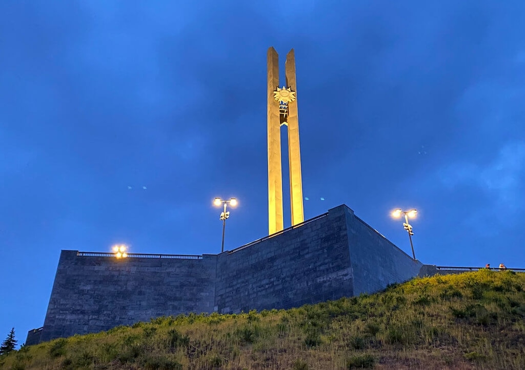 Стела днем выглядит вполне себе обычным памятником, а вот в вечерней темноте смотрится гораздо эффектнее.