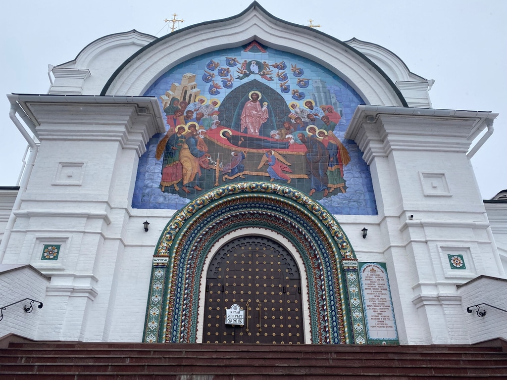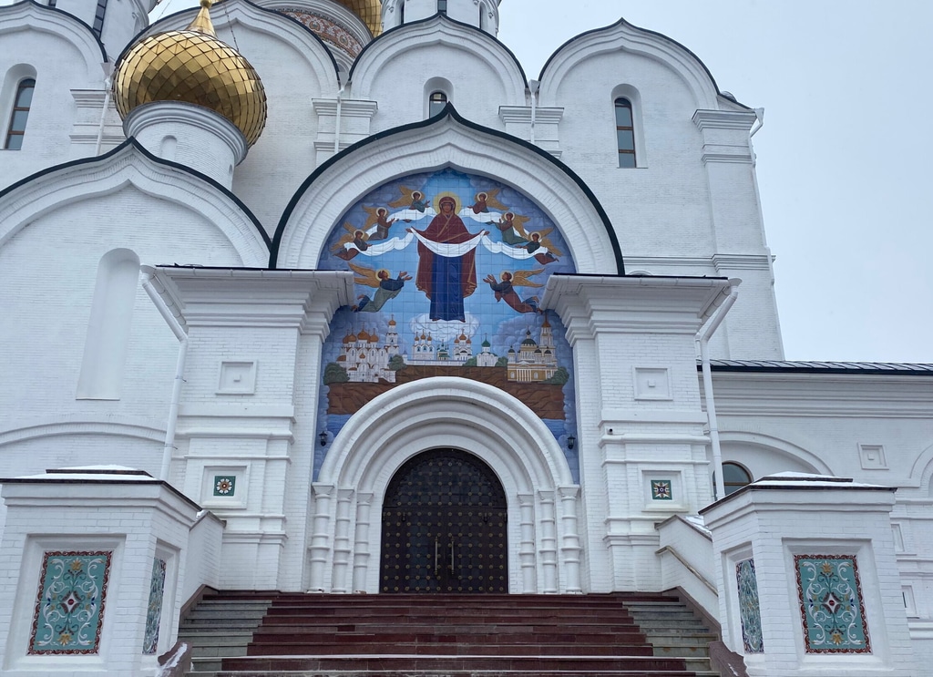 Парадный вход в Успенский собор украшают израсцовая арка и мозаичная икона Успения Пресвятой Богородицы.