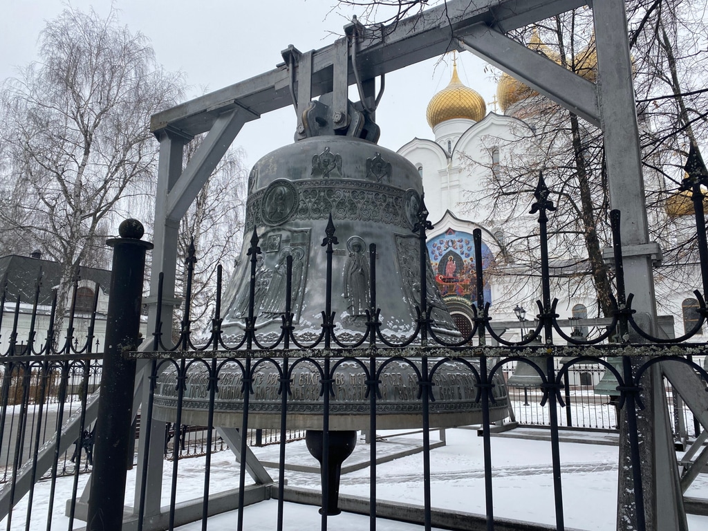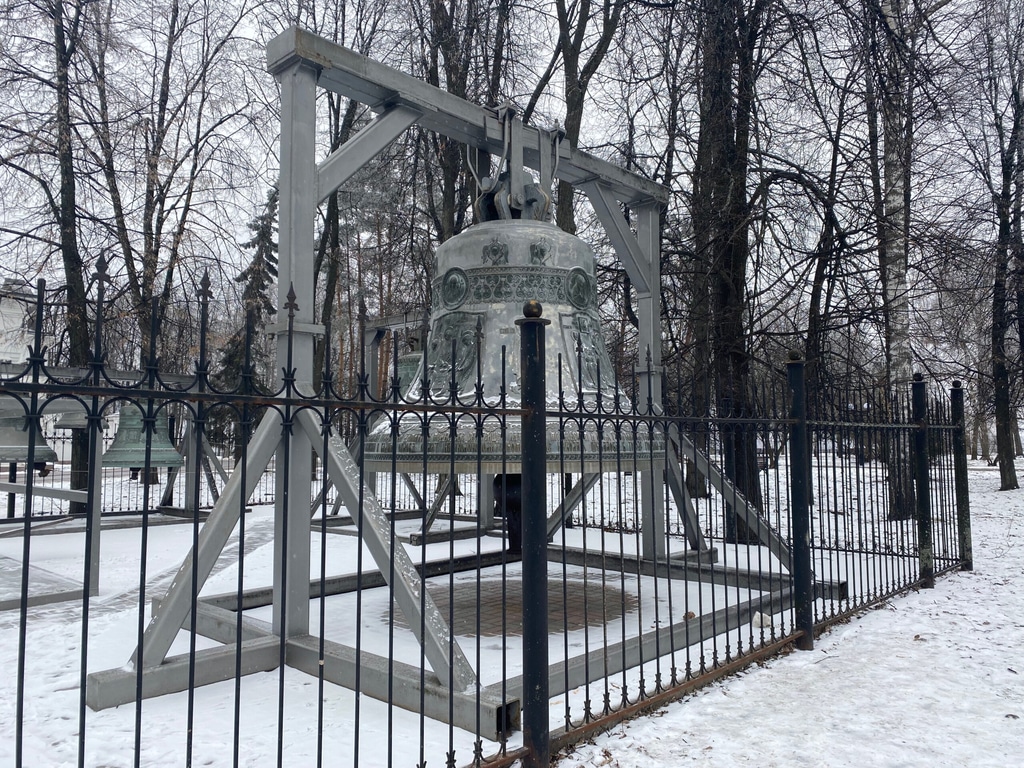 Справа от входа за железным забором — выставка колоколов для будущей колокольни. Ее давно планируют построить рядом с храмом, но до сих пор работы так и не начались.