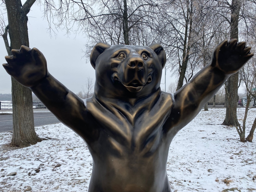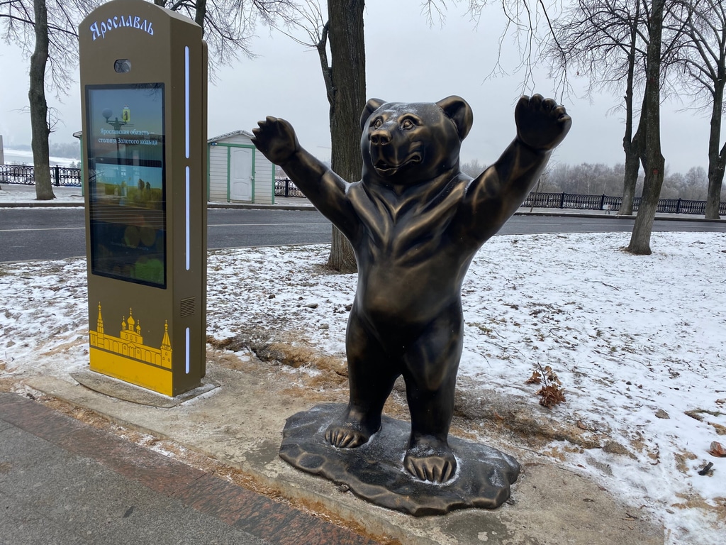 Неподалеку расположился стенд с информацией для туристов и готовый заключить всех в объятия медведь. Медведь — символ Ярославля.