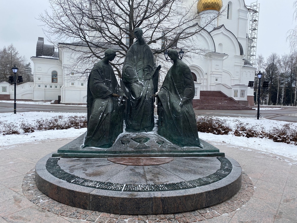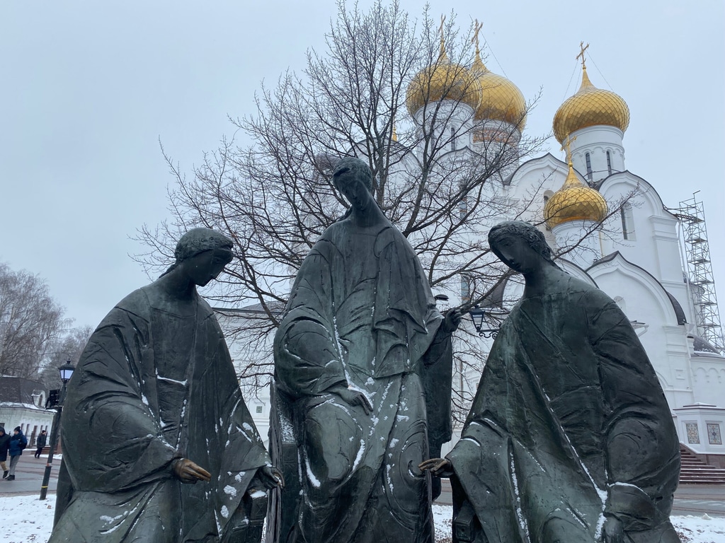 Рядом со входом со стороны Волги возвышается скульптура «Троица», которая повторяет сюжет иконы Андрея Рублева с таким же названием. Скульптуру установили здесь в 1995 году. Подобных памятников в нашей стране нигде больше нет.