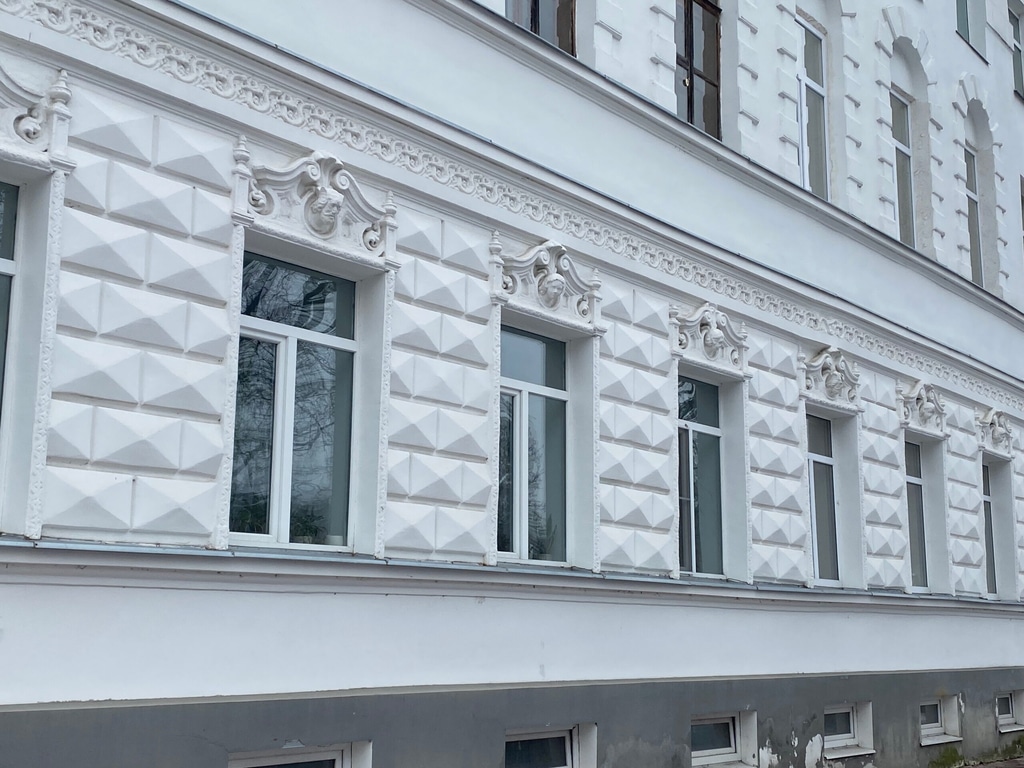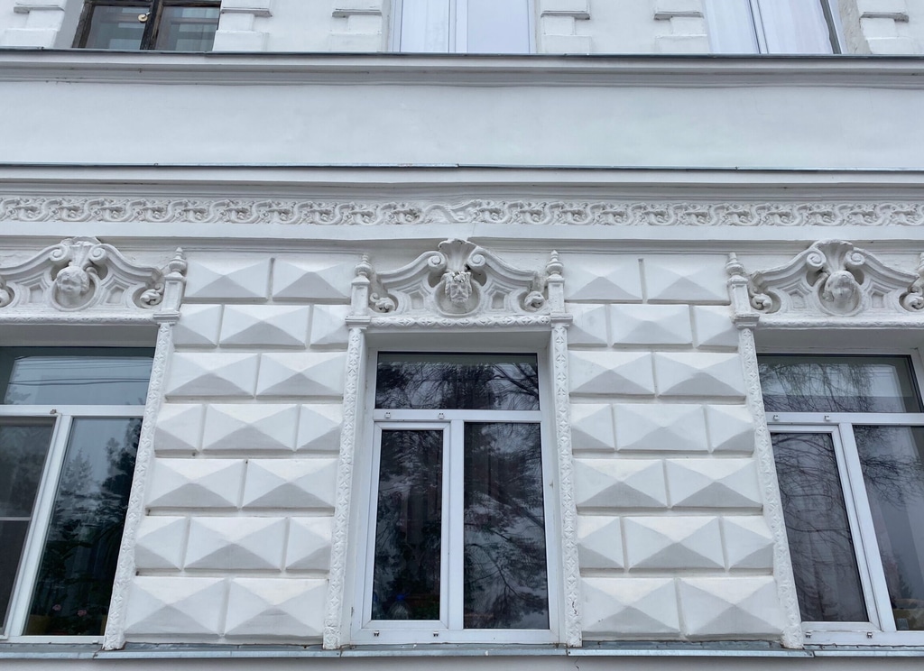 Верх окон первого этажа украшают женские и мужские головы. Такое не так часто встречается в архитектуре.