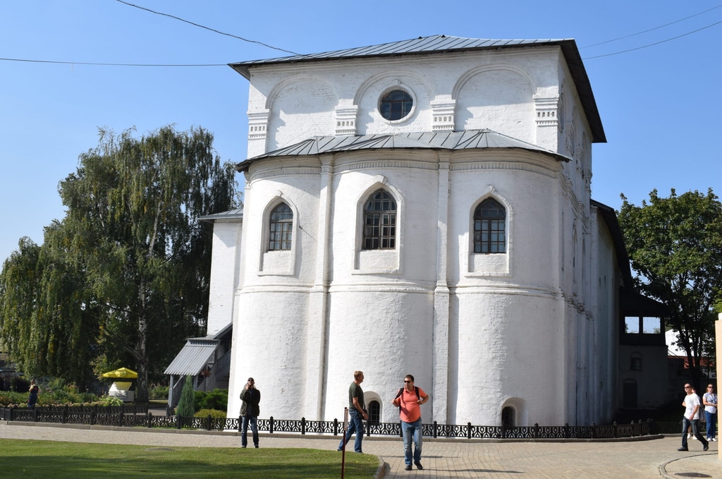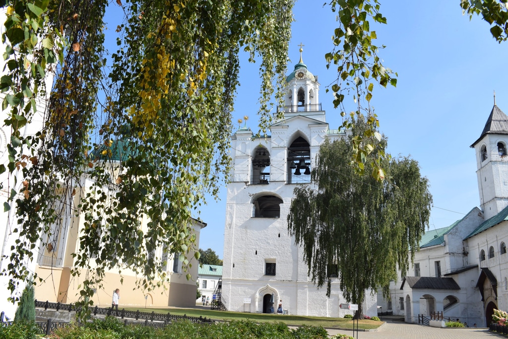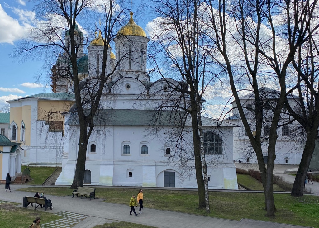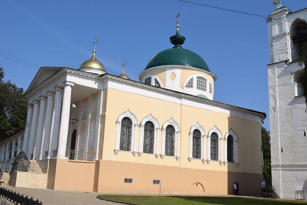 К белокаменному Спасо-Преображенскому собору вплотную примыкает церковь Ярославских чудотворцев Федора, Давида и Константина в желто-белых тонах.